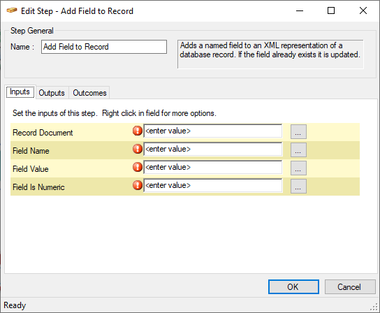 | 1. | Record Document | (Mandatory) | The string containing an xml representation of a record. If building a record from scratch, this may be passed in empty. On output this contains the record representation with the new field value added or updated. |