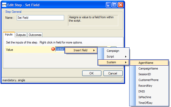 | 1. | Value | (Mandatory) | The value you wish to assign. This can be a fixed value or a System, Campaign or Script field. Fig. 1 shows the System variable AgentName being assigned as the Input value. |