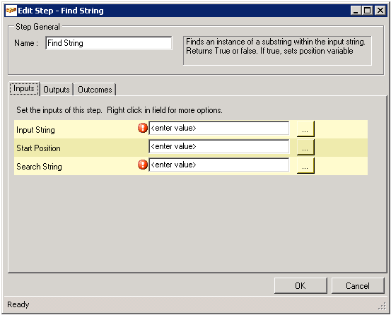 | 1. | Input String | (Mandatory) | The string that will be searched for an instance of the Search String |
