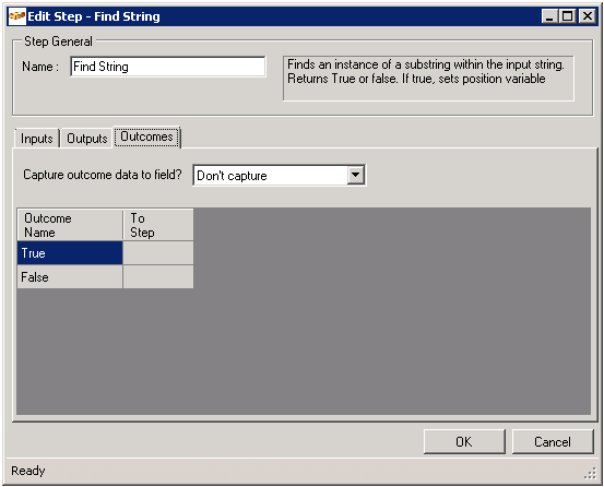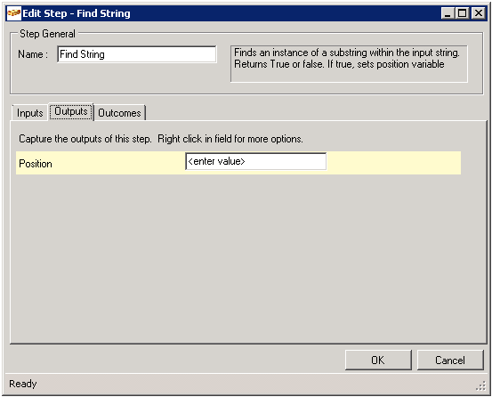 Used to find an instance of a substring within the input string. It the substring is found, the start position of the substring is returned within the Position output.