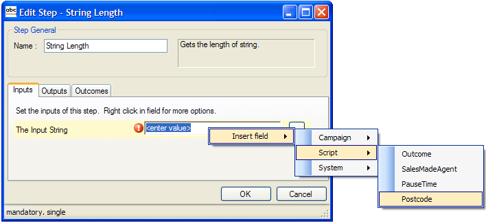 | 1. | The Input String | (Mandatory) | May be a System, Campaign or Script field (Fig. 1). In this example, the input string is a UK Postcode which must be less than 8 and more than 6 characters. |