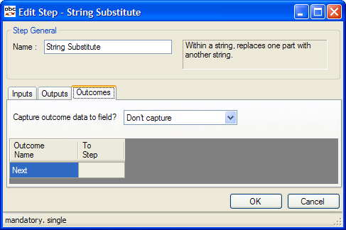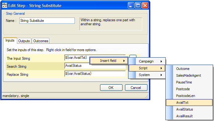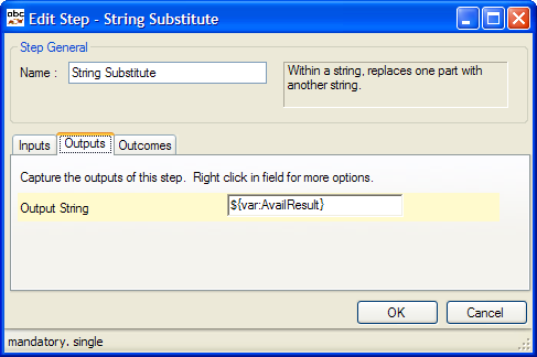 | 1. | Output String | The resultant string In Fig. 2, this is captured to the Script variable AvailResult. The Input String (AvailTxt) is not changed |