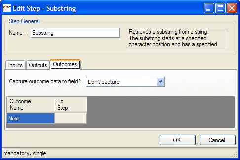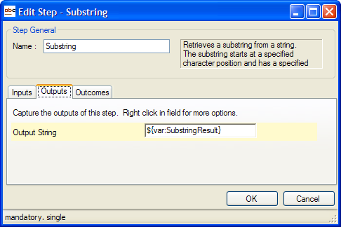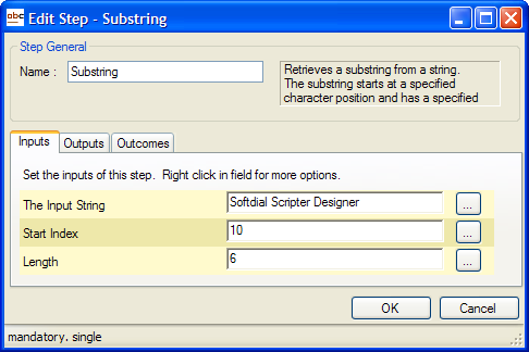 | 1. | Output String | The resultant string In Fig. 2, this holds the value Script, which is captured to the Script variable SubstringResult. The Input String is not changed. |