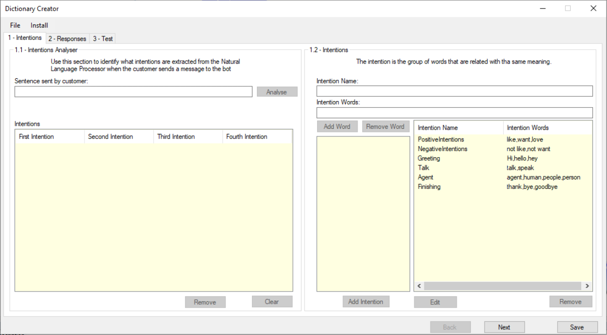 A new dictionary will be created based on default dictionary. The default dictionary already has some intentions and responses that will always be required.